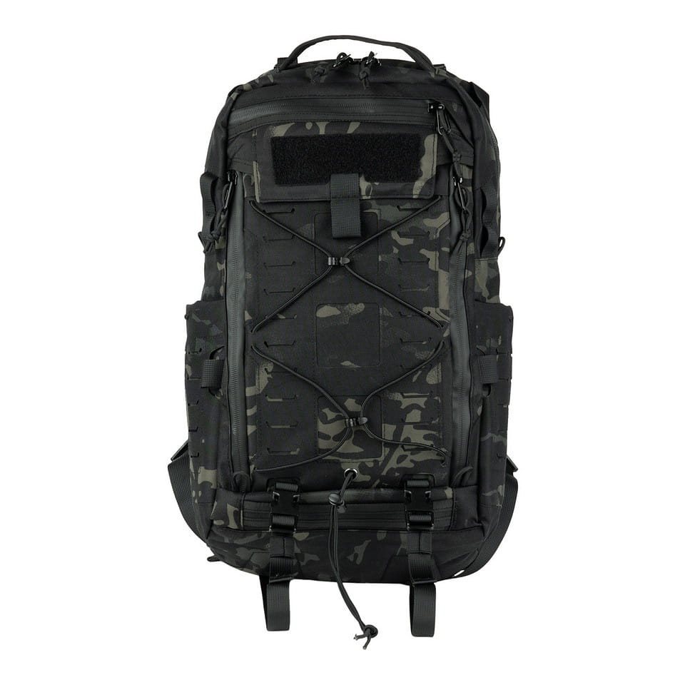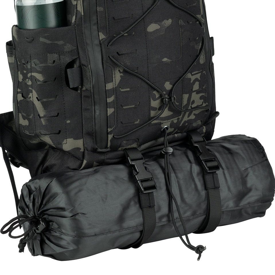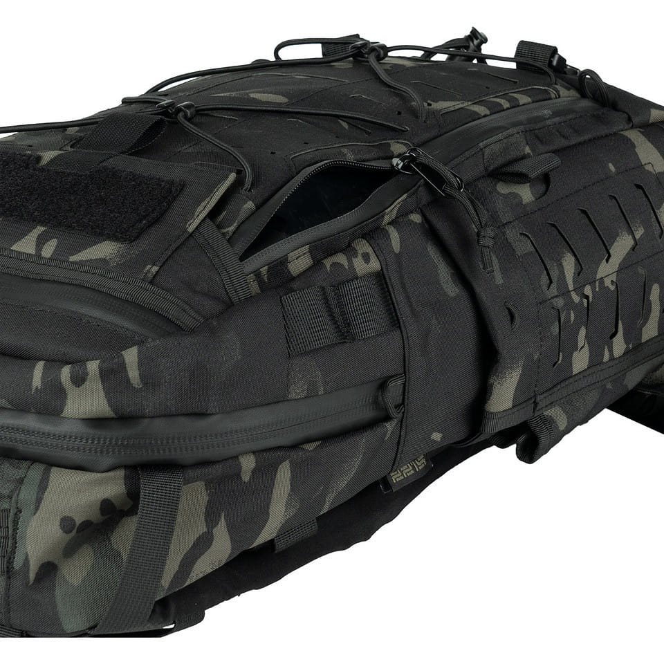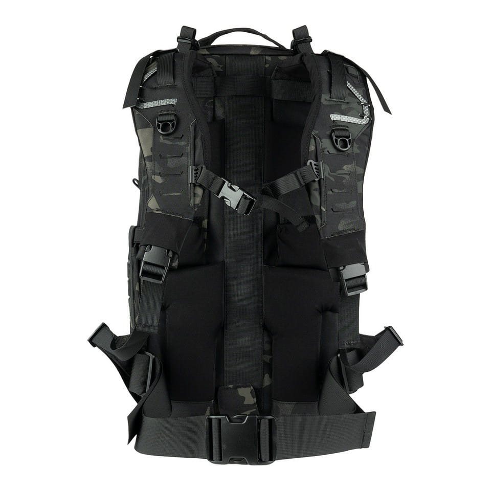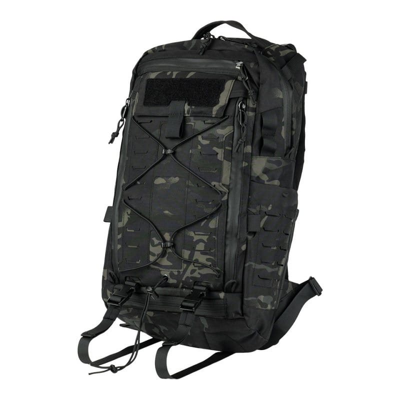 Gli spallacci regolabili in altezza sono ben imbottiti, dotati di sgancio rapido, cinghie di stabilizzazione e cinghia pettorale elastica con regolazione in altezza. La parte posteriore è rinforzata con una barra di alluminio e nella parte inferiore è presente una cintura lombare con fibbia in plastica. Ai lati sono presenti tasche per bottiglie che possono contenere bottiglie in PET di grandi dimensioni o bottiglie da un litro tipo Nalgene. La parte superiore e inferiore dello zaino sono dotate di maniglie per un facile trasporto. Il pannello frontale è cucito con una trama laser MOLLE/PALS e presenta un cordino elastico con possibilità di chiusura. La tasca frontale superiore con chiusura a zip è cucita all'esterno con velcro per la personalizzazione con toppe o etichette.