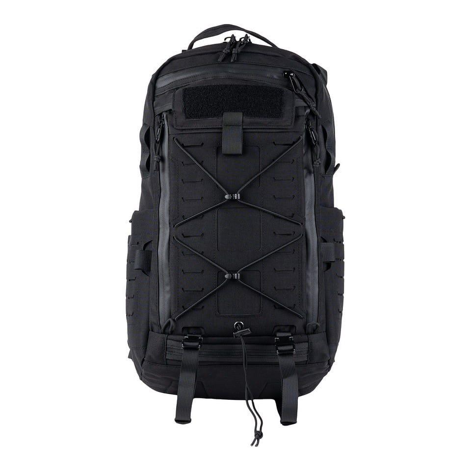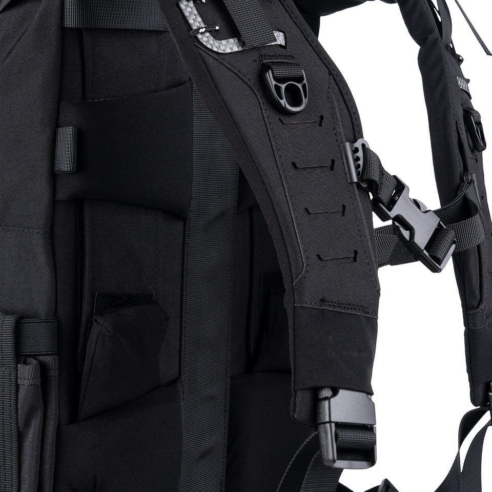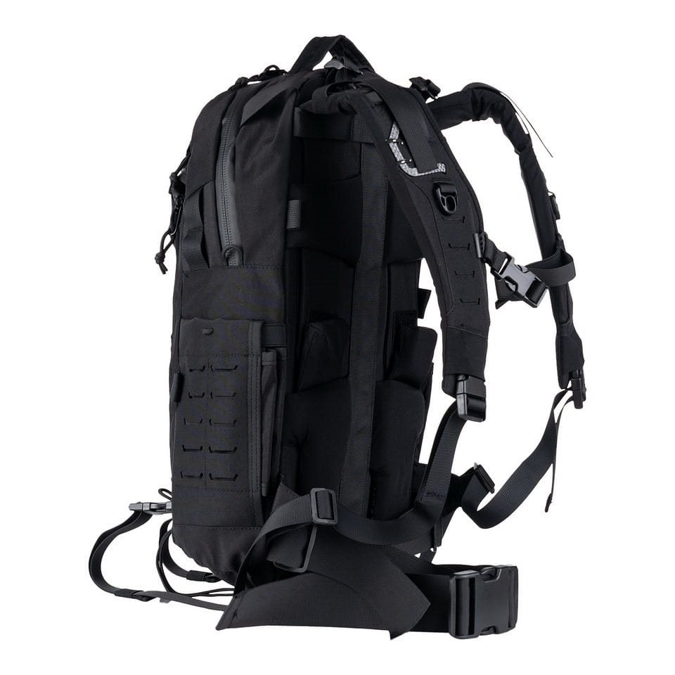 Gli spallacci regolabili in altezza sono ben imbottiti, dotati di sgancio rapido, cinghie di stabilizzazione e cinghia pettorale elastica con regolazione in altezza. La parte posteriore è rinforzata con una barra di alluminio e nella parte inferiore è presente una cintura lombare con fibbia in plastica. Ai lati sono presenti tasche per bottiglie che possono contenere bottiglie in PET di grandi dimensioni o bottiglie da un litro tipo Nalgene. La parte superiore e inferiore dello zaino sono dotate di maniglie per un facile trasporto. Il pannello frontale è cucito con una trama laser MOLLE/PALS e presenta un cordino elastico con possibilità di chiusura. La tasca frontale superiore con chiusura a zip è cucita all'esterno con velcro per la personalizzazione tramite toppe o etichette.