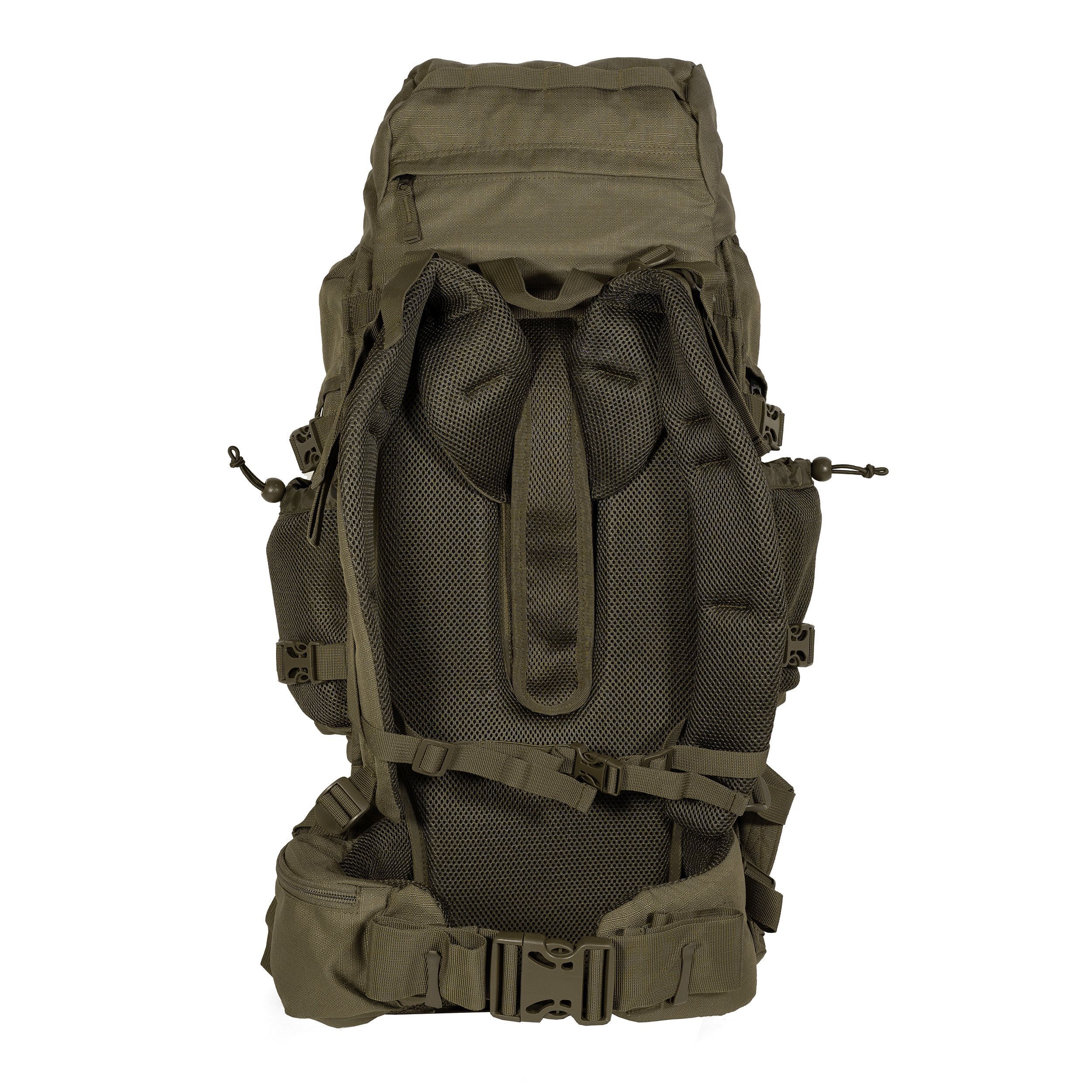 Zaino da spedizione a due scomparti con accesso superiore, inferiore e laterale. L'accesso superiore è dotato di un coperchio con una spaziosa tasca esterna e interna e di ganci per il fissaggio dell'attrezzatura. L'accesso inferiore è protetto da una cerniera a doppio cursore coperta da una patta. È possibile accedere allo scomparto principale anche tramite una cerniera verticale coperta da una patta, situata sotto il fissaggio delle cinghie di compressione. All'interno dello zaino si trova una piccola tasca con cerniera per gli oggetti di valore, due tasche laterali adatte ad esempio per bottiglie PET da 1,5 litri e uno scomparto profondo sul retro. Lo spazio interno dello zaino può essere diviso in uno scomparto superiore e uno inferiore tramite una patta con cerniera. Lo zaino dispone di sei tasche laterali. Quelle più grandi sono chiudibili con cerniere a doppio cursore e possono contenere, ad esempio, una bottiglia Nalgene da 1 litro. Su di esse si trovano tasche a rete aperte nella parte superiore. Altre tasche aperte si trovano nella parte inferiore dello zaino e, in combinazione con le cinghie di compressione, possono essere utilizzate, ad esempio, per riporre bastoncini da trekking o altri oggetti di forma simile. Sulla parte anteriore si trova un laccio elastico. Dietro di esso c'è uno scomparto in rete aperto nella parte superiore e, infine, una grande tasca piatta accessibile tramite una cerniera verticale coperta da una patta. Non mancano nemmeno i passanti per fissare le piccozze. Il fondo dello zaino è dotato di passanti e anelli a D per le cinghie di fissaggio e in una piccola tasca si trova un impermeabile integrato.