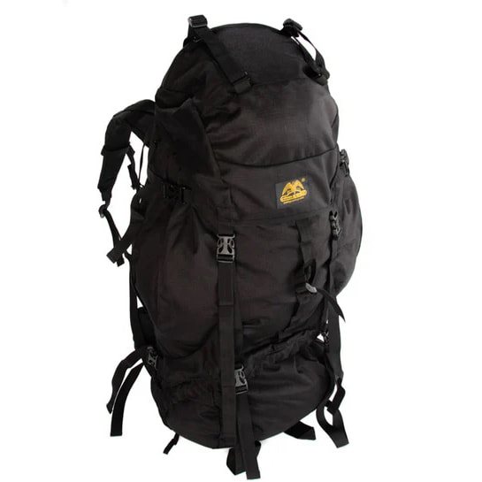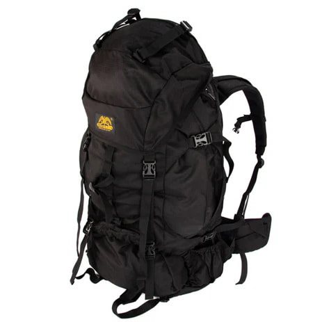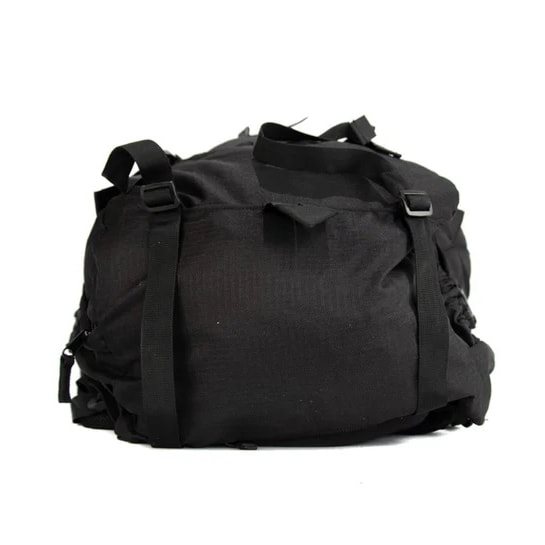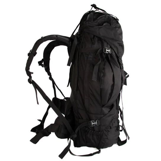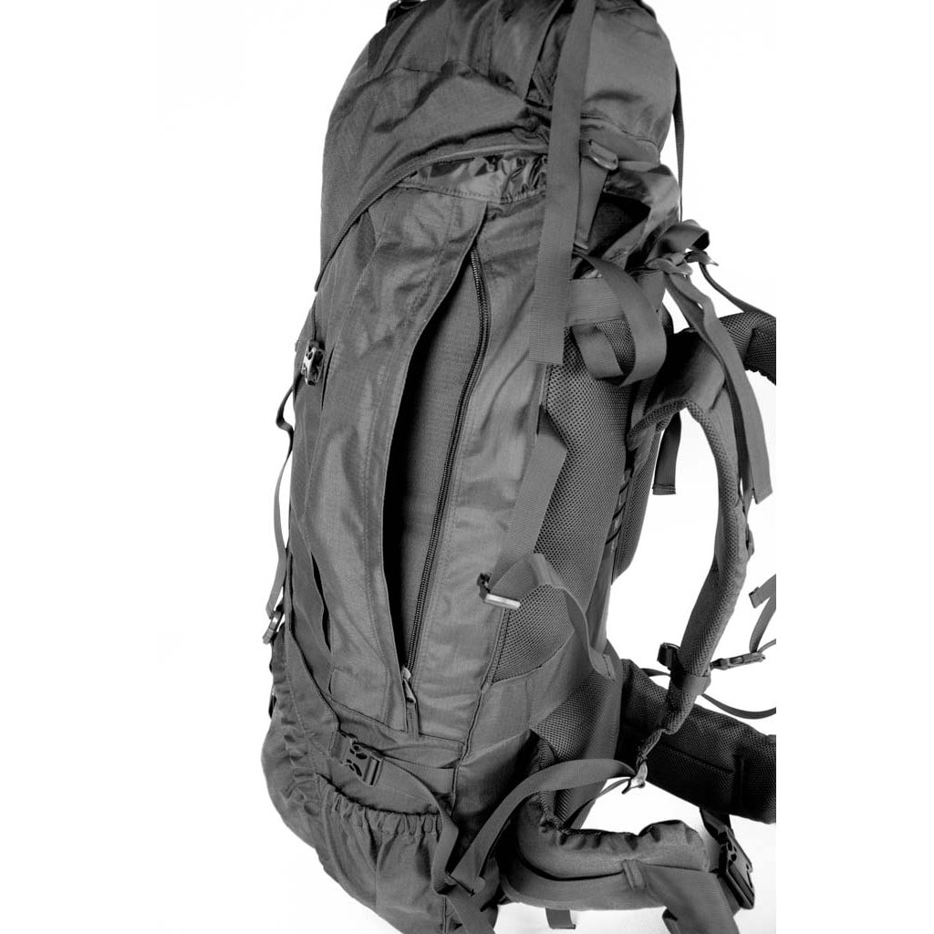 Zaino da spedizione a due scomparti con apertura superiore e inferiore. L'apertura superiore è dotata di un coperchio regolabile in altezza con una spaziosa tasca esterna e interna e cinghie per fissare l'attrezzatura. L'accesso inferiore è assicurato da una cerniera a doppio cursore coperta da una patta. Lo spazio interno dello zaino può essere diviso in uno scomparto superiore e uno inferiore tramite un collare di chiusura. Lo zaino dispone di quattro tasche laterali. Quelle più grandi sono chiuse da cerniere verticali, mentre quelle inferiori aperte sono adatte per bottiglie più piccole o per riporre bastoncini da trekking. Ai lati si trovano inoltre cinghie di compressione e sulla parte frontale una tradizionale asola per piccozza e una cinghia con occhielli, ad esempio per fissare moschettoni.