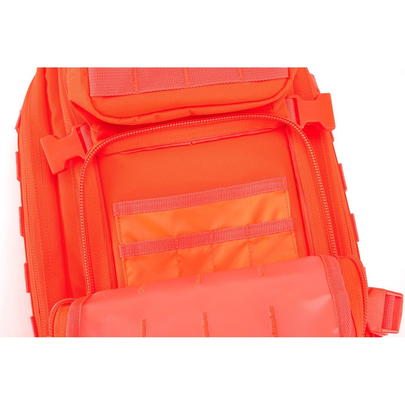 Per riporre l'attrezzatura sono disponibili due ampi scomparti e due tasche più piccole. Gli scomparti e le tasche sono accessibili tramite cerniere a doppio cursore dotate di tiretti. La tasca superiore più piccola è senza divisori, mentre quella inferiore contiene un pratico organizer. All'interno dello scomparto principale sono presenti diverse tasche per riporre documenti e altri piccoli oggetti. Sul fondo si trovano altre due cinghie, ideali per fissare, ad esempio, una giacca a vento leggera o un piccolo materassino.