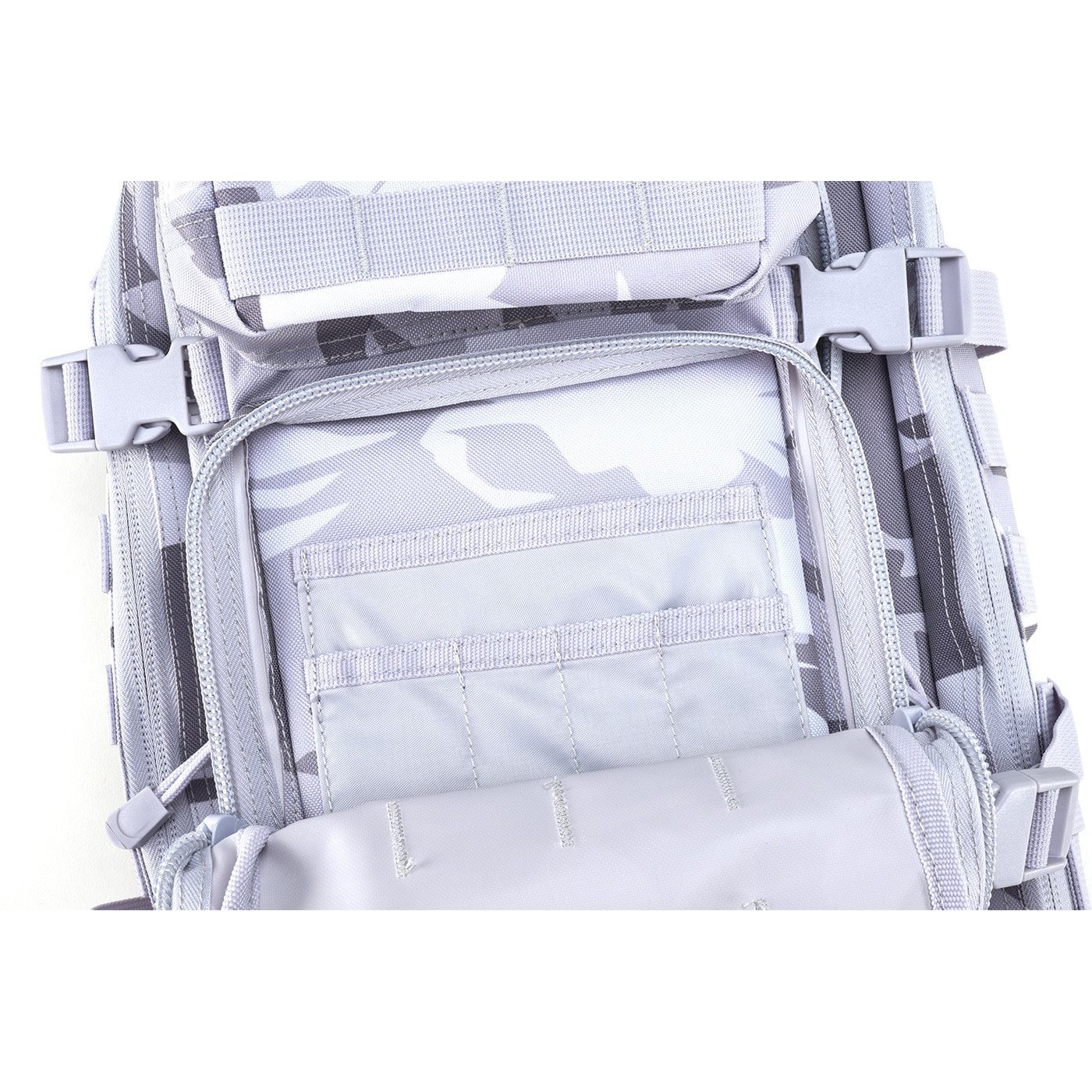 La parte posteriore dello zaino è leggermente imbottita, contiene una tasca adatta per inserire una sacca idratante e nella parte superiore è dotata di una maniglia per un facile trasporto. Gli spallacci sono regolabili in altezza, anatomicamente sagomati, imbottiti, dotati di rete 3D e cinturino elastico sul petto con chiusura in plastica fastex. La cintura ventrale è semplice e anch'essa dotata di fibbia fastex. Ai lati dello zaino è presente un'ampia trama MOLLE/PALS che serve per fissare tasche compatibili e altre attrezzature. Oltre alla trama, sul lato sono presenti anche due cinghie di compressione.