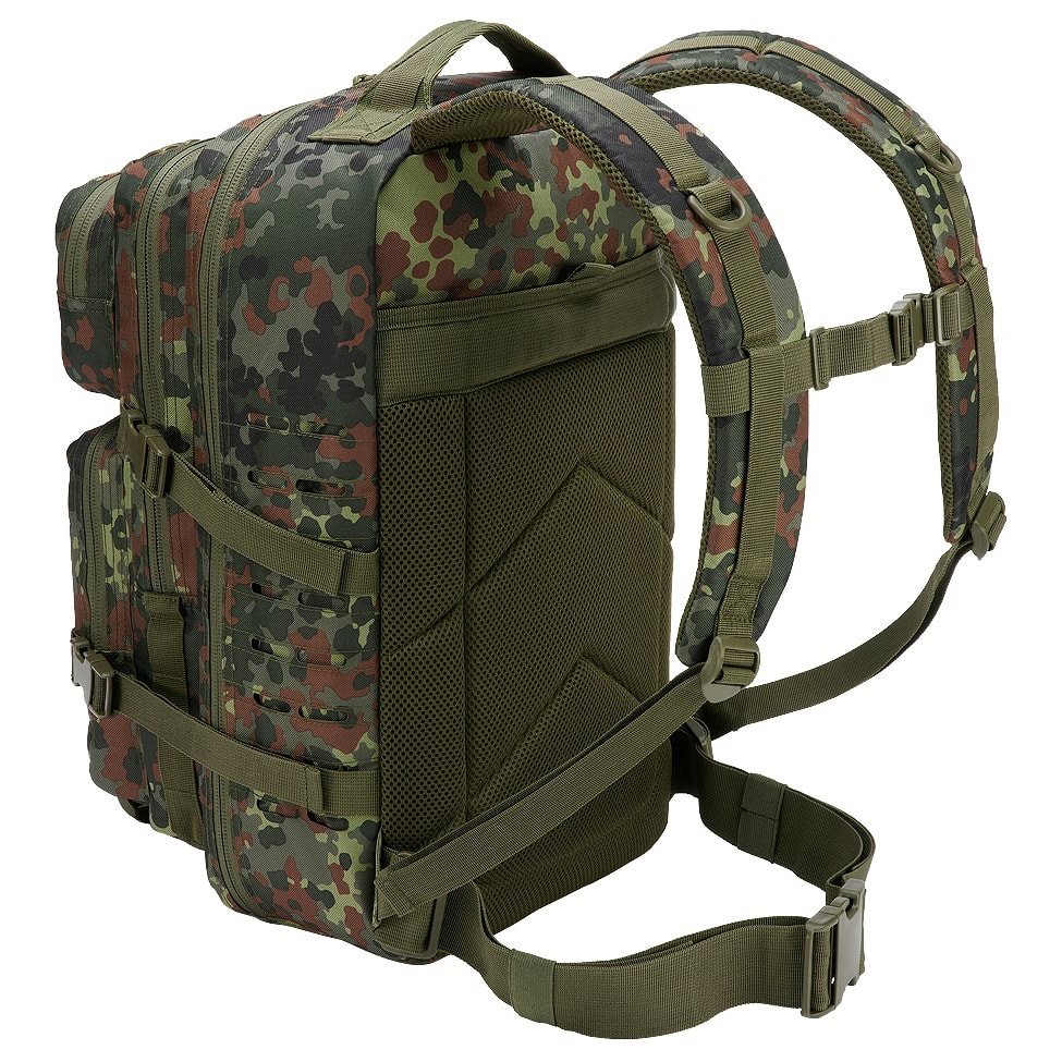 La parte posteriore dello zaino è leggermente imbottita, contiene una tasca adatta per inserire una sacca idratante e nella parte superiore è dotata di una maniglia per un facile trasporto. Gli spallacci sono regolabili in altezza, anatomicamente sagomati, imbottiti, dotati di rete 3D e cinturino pettorale elastico con chiusura in plastica fastex. La cintura ventrale è semplice e anch'essa dotata di fibbia in plastica. Ai lati dello zaino è presente un'ampia trama MOLLE/PALS intagliata al laser che serve per fissare tasche compatibili e altre attrezzature. Oltre alla trama, sul lato sono presenti anche due cinghie di compressione.