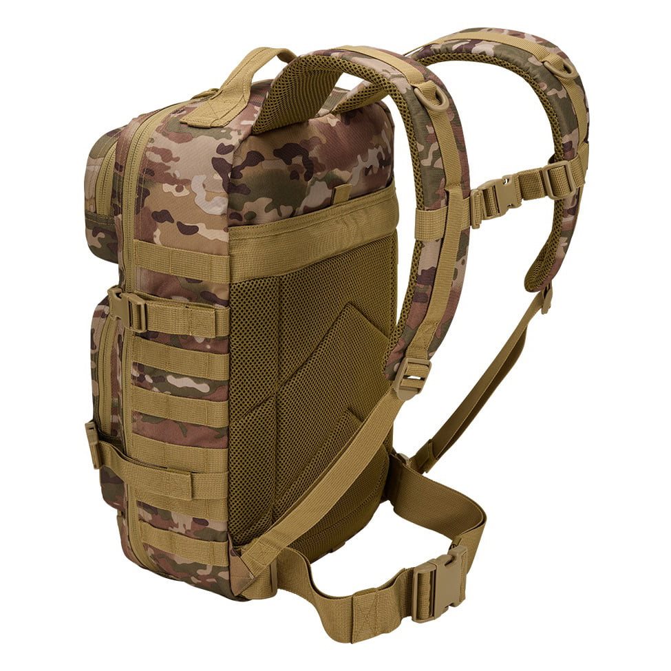 La parte posteriore dello zaino è leggermente imbottita, contiene una tasca adatta per inserire una sacca idrica e nella parte superiore è dotata di una maniglia per un facile trasporto. Gli spallacci sono regolabili in altezza, anatomici, imbottiti, dotati di rete 3D e cinturino elastico sul petto con chiusura in plastica fastex. Ai lati dello zaino è presente un'ampia trama MOLLE/PALS che serve per fissare tasche compatibili e altre attrezzature. Oltre alla trama, sul lato sono presenti anche due cinghie di compressione.