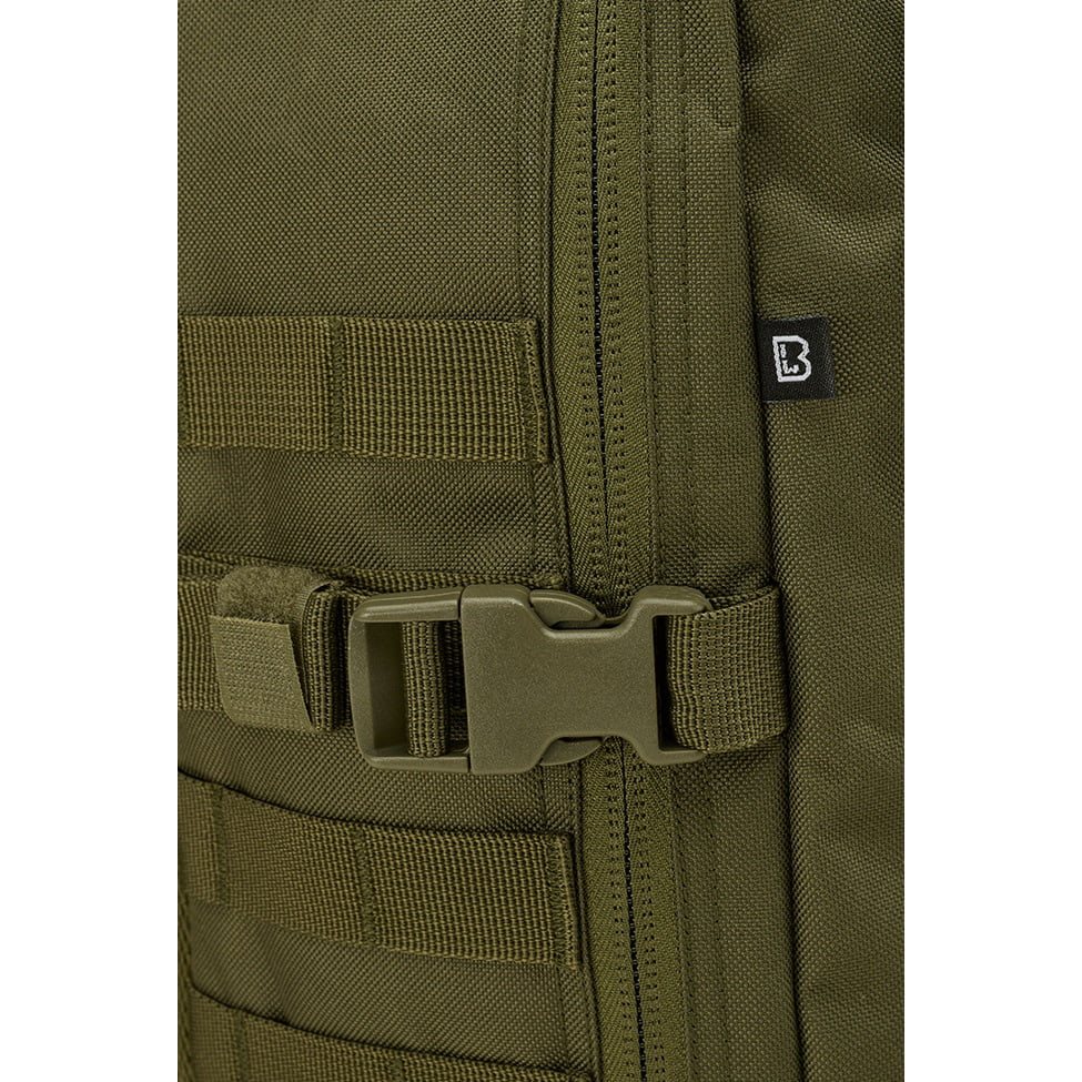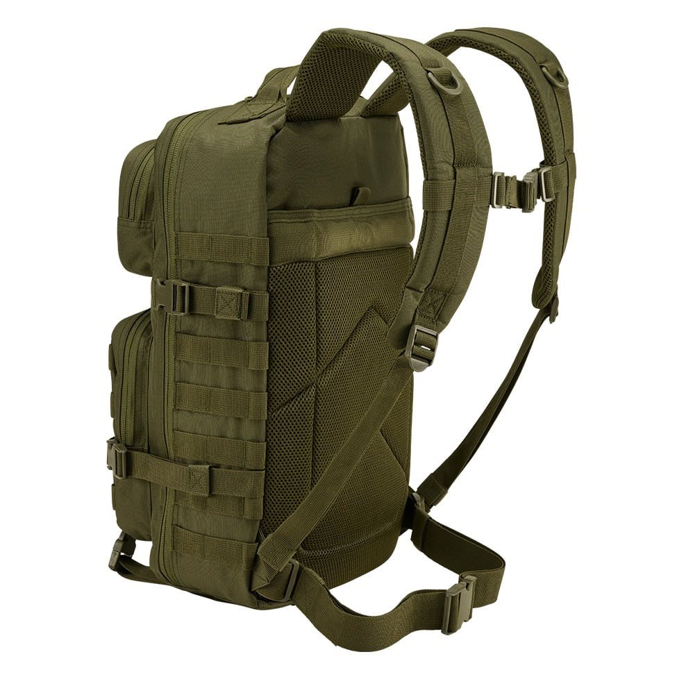 La parte posteriore dello zaino è leggermente imbottita, contiene una tasca adatta per inserire una sacca idrica e nella parte superiore è dotata di una maniglia per un facile trasporto. Gli spallacci sono regolabili in altezza, anatomicamente sagomati, imbottiti, dotati di rete 3D e di una cinghia pettorale elastica con chiusura in plastica fastex. Ai lati dello zaino è presente un'ampia trama MOLLE/PALS che serve per fissare tasche compatibili e altre attrezzature. Oltre alla trama, sul lato sono presenti anche due cinghie di compressione.