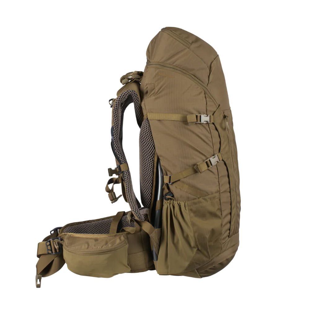 I lati dello zaino sono piuttosto semplici, presentano una coppia di cinghie di compressione per fissare attrezzature aggiuntive e tasche parzialmente elastiche con la possibilità di chiuderle con un cordino con fermo in plastica. Quasi tutta la parte anteriore è occupata da una tasca elastica piatta con accesso tramite cerniera con un robusto tiretto. Il coperchio è dotato di uno spazio più piccolo per riporre piccoli oggetti. Questo spazio contiene una tasca più piccola in rete chiusa con cerniera. La cerniera inferiore conduce all'interno dello zaino.