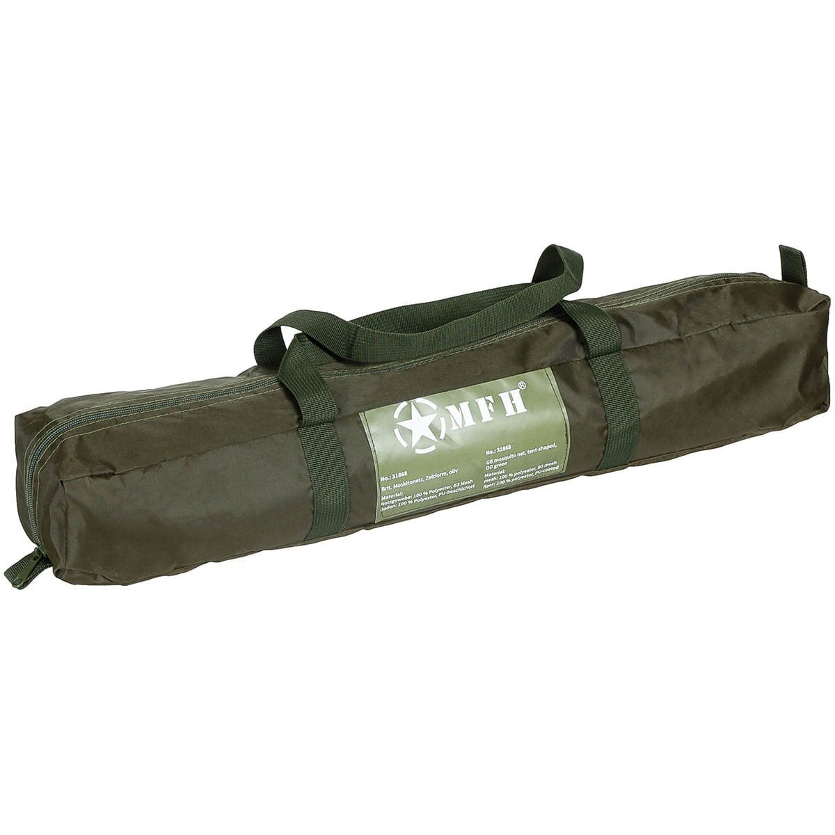 Replica di una "tenda" tropicale con zanzariera, utilizzata attivamente dall'esercito britannico nelle zone climatiche calde. La zanzariera protegge in modo affidabile dagli insetti volanti e striscianti presenti in natura e, grazie alle sue dimensioni, può essere utilizzata in combinazione con una sedia a sdraio da campo. Il pavimento della zanzariera è realizzato in 100% poliestere con rivestimento impermeabile in PU con colonna d'acqua di 1500 mm. La delicata rete superiore è realizzata in poliestere. Le aste strutturali sono in fibra di vetro. L'ingresso alla zanzariera è dotato di cerniera verticale e orizzontale. All'interno è presente un piccolo scomparto per piccoli oggetti, chiuso con velcro. Fornita con picchetti in acciaio e custodia per il trasporto.